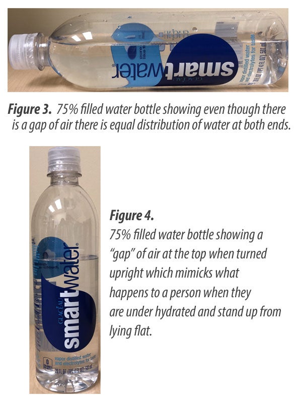 Our bodies are very similar to that bottle of water. When we are lying flat on our back, there is an equal amount of fluid in our legs as in our head and neck. However, when we stand up, gravity pulls the fluid down to our legs and feet and there is a temporary gap left at the top (OUR BRAIN!). This results is a brief loss of oxygen to the brain, which causes the sensation of lightheadedness and can cause someone to “pass out”.