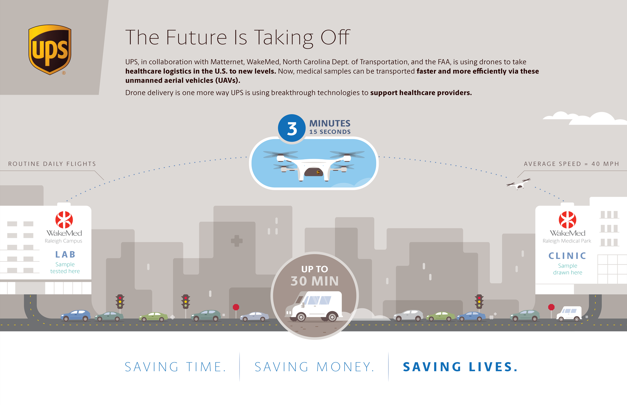 The flight was a collaboration the North Carolina Department of Transportation (NC DOT), the Federal Aviation Administration (FAA), Matternet, UPS and WakeMed Innovations.