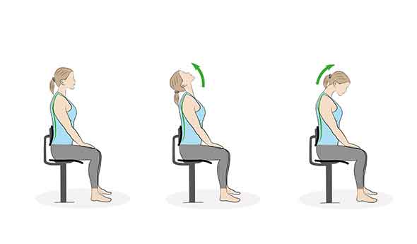 We then teach the patient to do neck extensions periodically during the day to ease muscle strain. To do a neck extension, simply sit back in a firm chair and extend your neck back as far as possible for 4 x 4 seconds in pain-free range only.