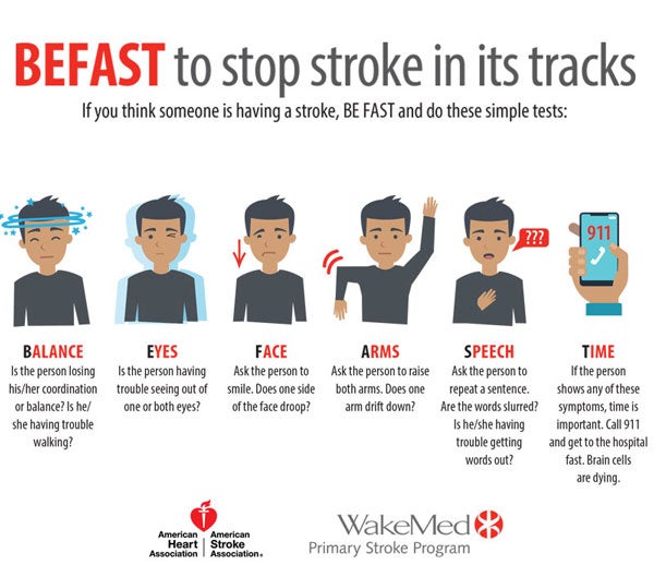 Many hospitals, including WakeMed, have expanded the FAST acronym that was previously used to BEFAST because issues with balance and vision – particularly when these issues occur suddenly – are common stroke symptoms.