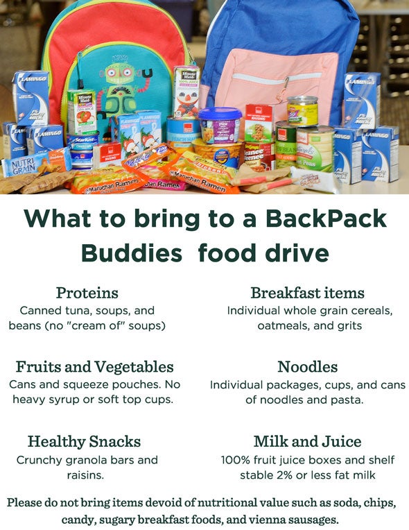 - Donate Funds: $35 provides a child with meals through BackPack Buddies for a whole month, and a $100 contribution can deliver 250 meals to those who need them.