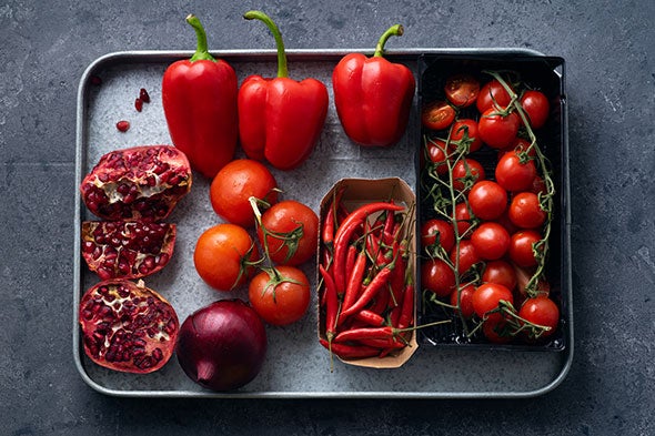 Red provides lycopene, which may help prevent the development of heart disease and some types of cancer (especially prostate cancers). Red produce options are red grapes and apples, cherries, watermelon, red bell peppers, and tomatoes. Fun fact: The lycopene in tomatoes is more available to the body when the tomatoes are cooked……especially in a little olive oil.