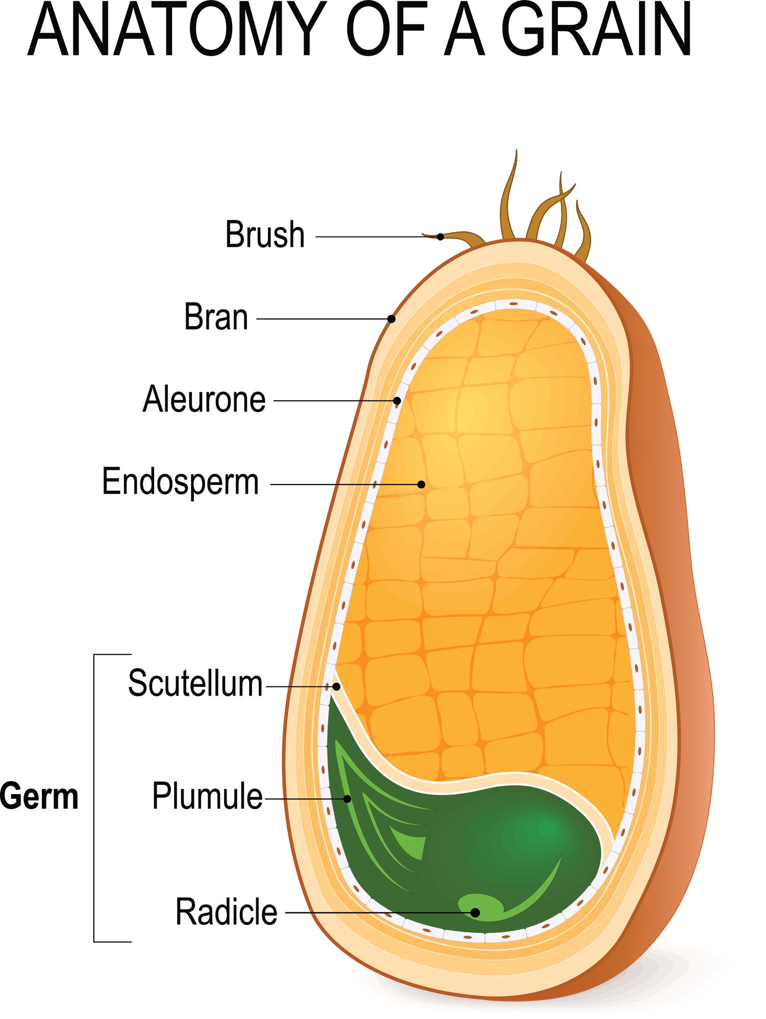 Grains are also known as kernels. They are the seed of a plant and are made of three main parts: the bran, endosperm and germ. The bran is the outer layer of a grain and has fiber, vitamins, minerals and other antioxidants. The middle layer is the endosperm, which has starchy carbohydrates, protein and some vitamins and minerals. The innermost part is the germ, which has vitamins, minerals, healthy fats and other antioxidants.
