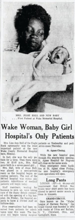 They had four children, and this baby would be the fifth. Previously, Mrs. Hall had delivered her children at St. Agnes Hospital — the local hospital for African Americans — but with the shuttering of that facility, they headed to WakeMed where they were offered comprehensive care in the squeaky clean, state-of-the-art medical center.