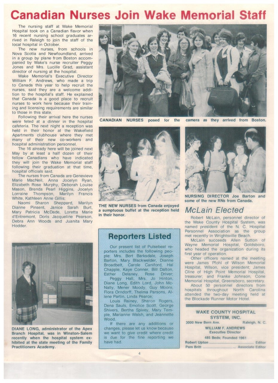 “In 1973, Wake ‘Memorial’ hospital representatives came to Nova Scotia to recruit nurses,” Privette recalls. “My classmates and I saw this as an excellent opportunity as new nursing graduates, and I arrived to North Carolina in September 1973.”