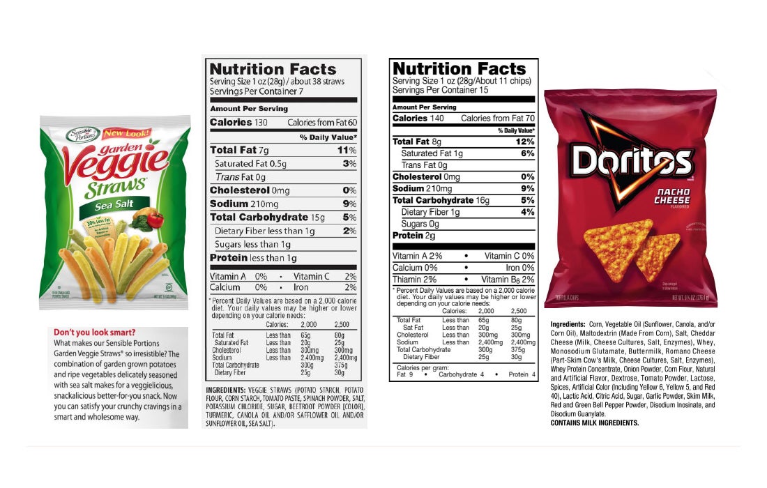 However, comparing Veggie Straws and Doritos shows almost identical nutrient facts. That doesn’t mean to avoid them, but it may be helpful to think of them as a chip instead of a vegetable when making your decision.