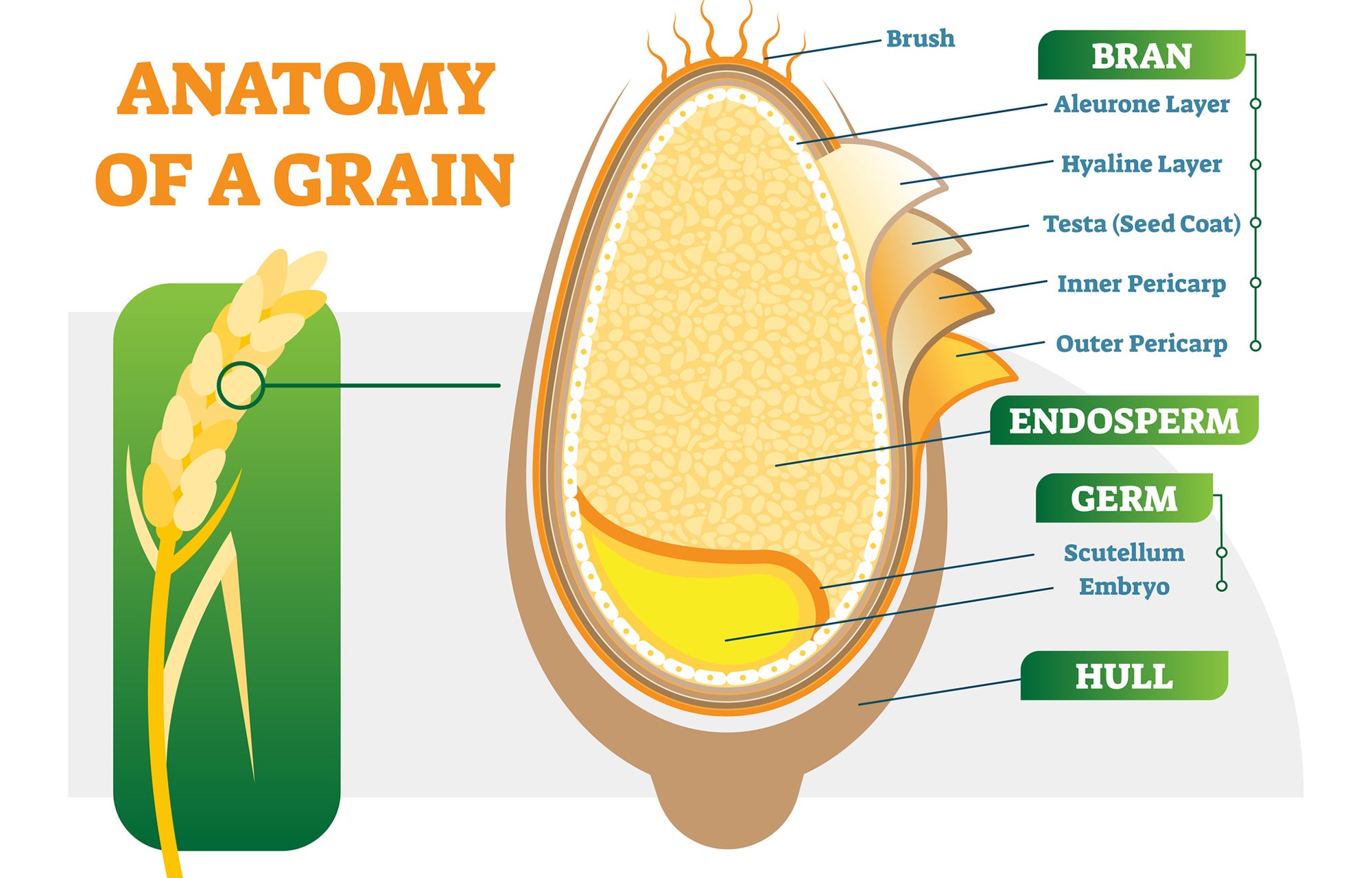 When grains are harvested, the hull is removed. For some grains, this leaves the bran intact, but for others, such as barley, the process is not as straightforward. Other important components of a grain are the endosperm and germ.