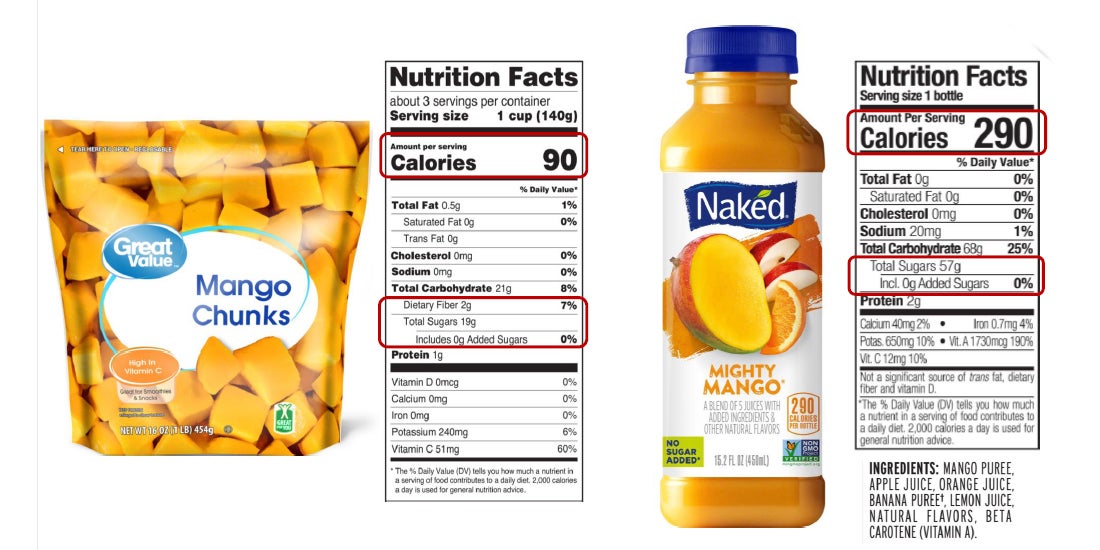 The comparison below is a great example of how frozen fruit and juiced fruit differ in their nutrient facts. You can see that the frozen mango, even though it has been peeled, still has fiber while the mango juice does not. Because the juice is a more concentrated source of sugar, the bottle contains about three times as many calories and grams of sugar as one cup of frozen mango chunks.