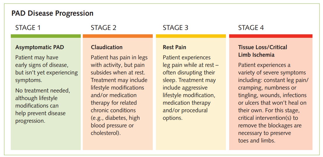 While most of us are aware of heart disease, its risk factors and complications, PAD gets a lot less attention — and often goes undetected. Because both PAD and heart disease are caused by plaque build-up, they’re often linked — making early diagnosis and treatment important to prevent further complications, such as heart attack or stroke.