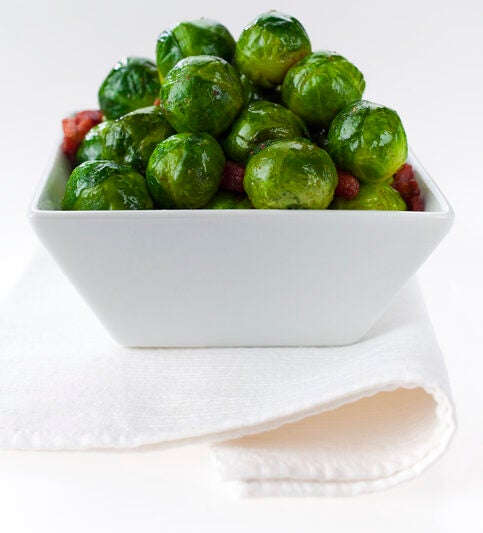 - Remove the brussels sprouts from the oven, add to a platter or tray, mix in cooked pancetta and drizzle with balsamic glaze. Serve warm.