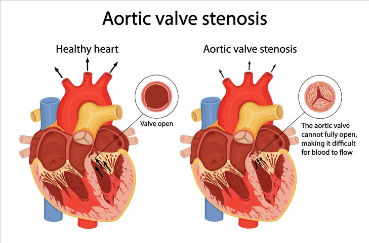 This occurs when the valve’s leaflet tissue becomes stiff and the opening is narrowed by calcification over time. When the opening becomes narrow, there’s less blood flow — causing the heart to pump harder.
