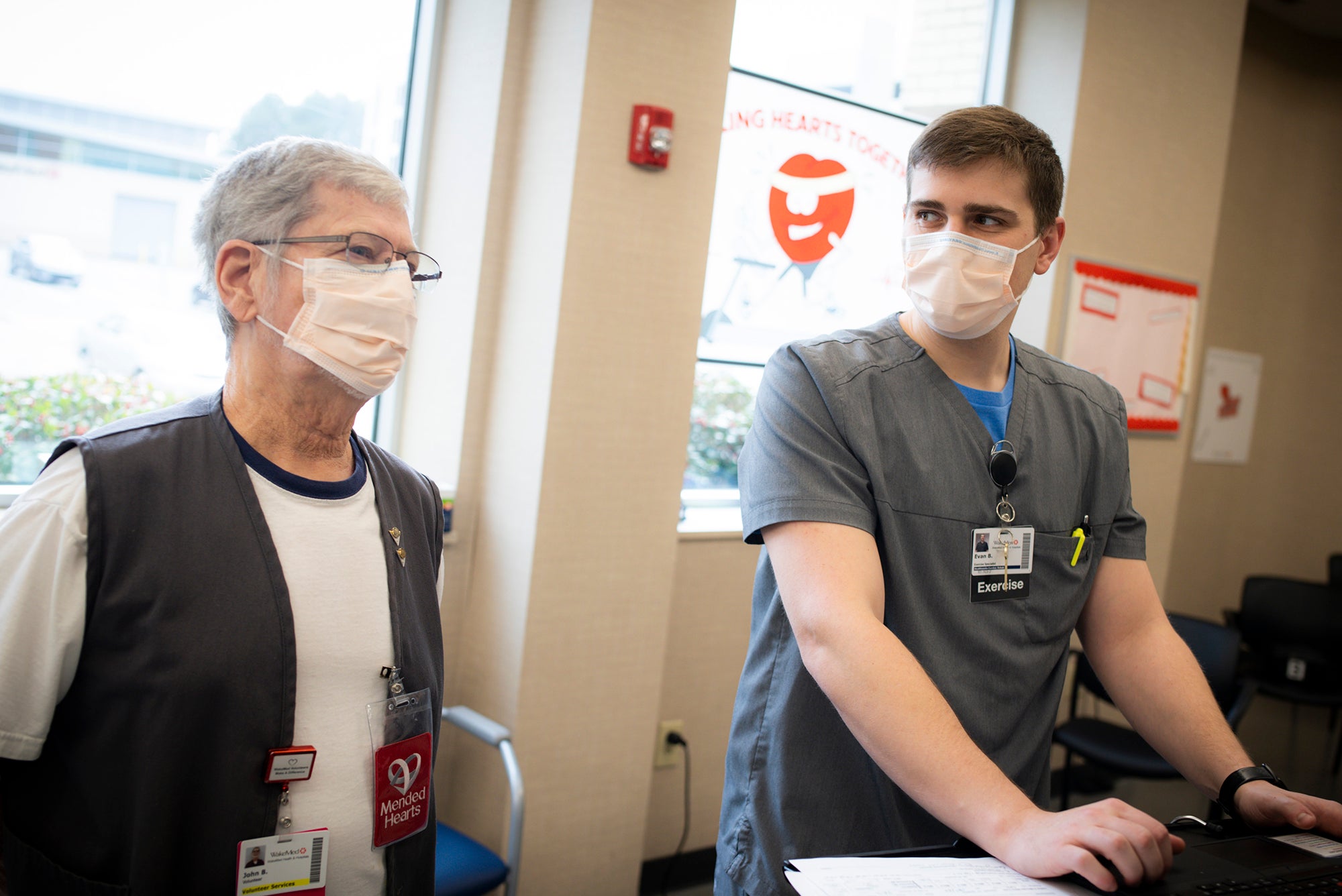 John begins each shift in Cardiac Rehab by sanitizing and setting up the therapeutic space — under the supervision of Molly diVincenzo, MS, ACSM RCEP, the Cardiac Rehab Exercise Specialist and Program Director. On Mondays, he will finish up in Mended Hearts. On Wednesdays and Fridays, if needed, he will visit patients with left ventricular assist devices (LVAD). This device is a pump for patients who have reached end-stage heart failure.