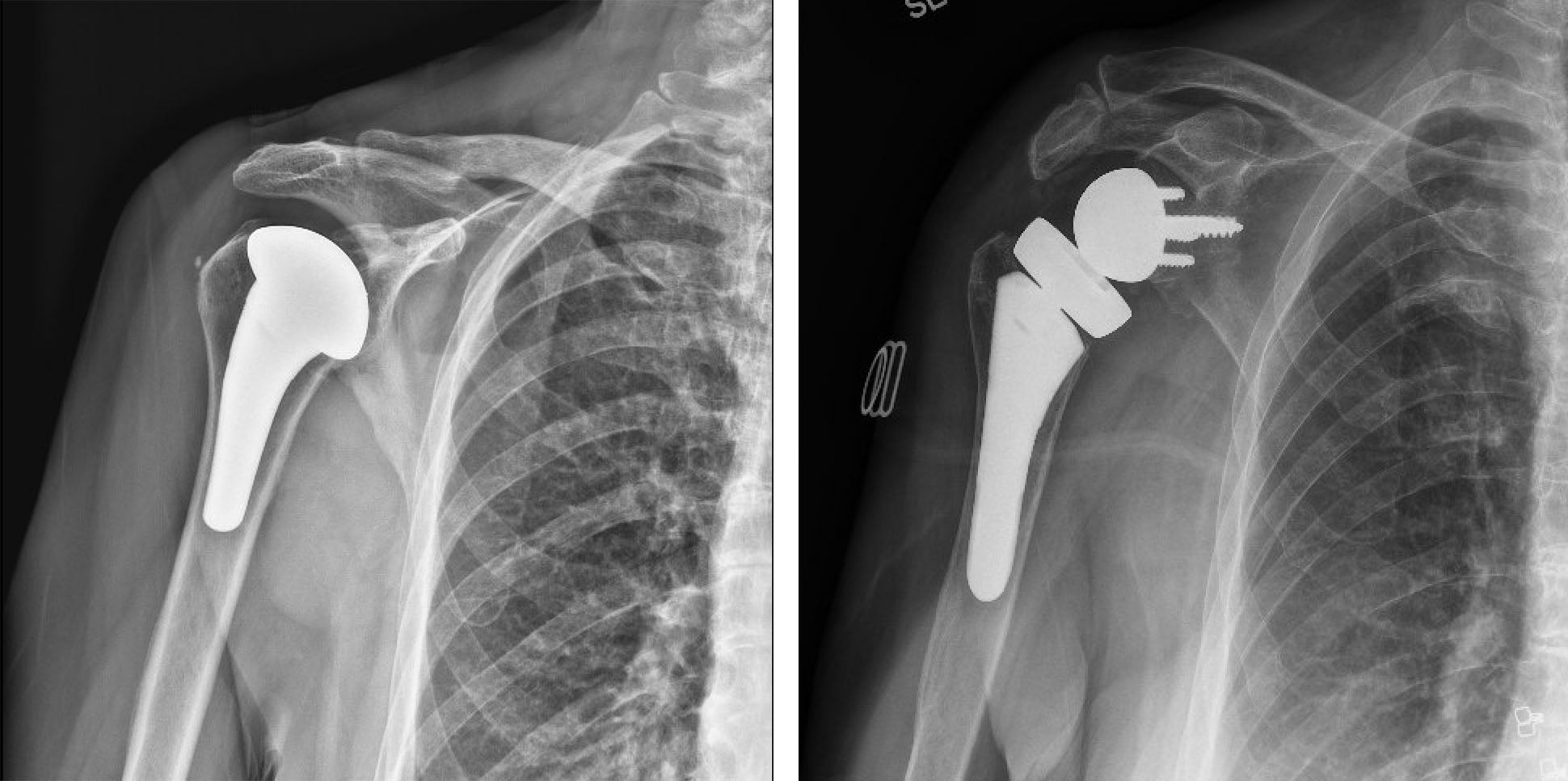 For patients with arthritis due to a torn rotator cuff or inflammatory arthritis, a reverse shoulder replacement may be recommended. This involves “reversing” the positions of the metal ball and plastic socket. A metal ball is attached to where the socket would normally be, while a plastic socket is attached to where the ball would normally be. This changes the center of rotation of the shoulder and allows other muscles in the shoulder to compensate for an absent or non-functioning rotator cuff. While shoulder range of motion is slightly less using a reverse shoulder replacement compared to a traditional shoulder replacement, the reverse shoulder replacement is more versatile and can be used in cases where there is significant bony erosion or deformity in the shoulder joint.