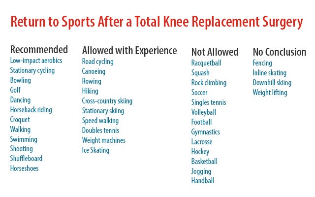 A: The American Academy of Orthopaedic Surgeons has some great recommendations on which activities are recommended versus those that aren’t recommended.