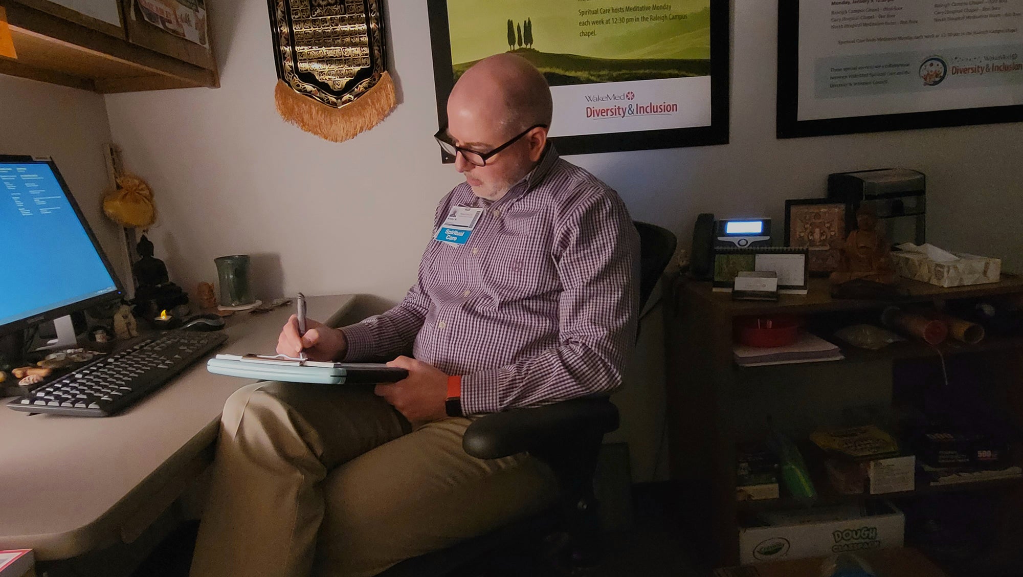 I feel that my workday begins the moment I step away from the car. Perhaps, it’s a chaplain thing, but even as I’m walking in, I feel a sense of responsibility. The way I carry myself, the way I look at others — this is all part of the role. I strive to be a joyous presence in these halls, and I don’t take joy lightly.