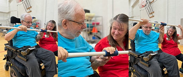 Admissions supervisor, Melanie Boyette explains, "They were both so very excited to be accepted for rehabilitation. Al's story is special as he had his stroke and was treated at WakeMed. He was too low functioning to qualify for inpatient rehab, so he went to a skilled nursing facility. When he was initially denied for WakeMed Rehabilitation and recommended for skilled nursing, he was dependent for all mobility and self-care. He had poor alertness and only opened his eyes briefly. Upon admission, he was talking, eating and moving. Over the course of therapy, he was pulling up on the parallel bars and was gait trained for eight feet by four feet. He is now using his power wheelchair to get around and loves it. He is eating regular food and is off thin liquids. He's got a long way to go, but he has come so far. He was very active and independent prior to the stroke, working as a teacher, and he has the drive to return."