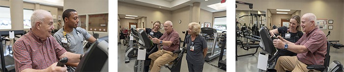 He shares, "My rehab involved initial physical assessment, equipment review, expectations, goals, education sessions regarding eating habits, hydration, an hour of biking, weight training and stretching. Multiple therapists monitored and assisted me, including Patrick Kerr, Brice Howell, Carol Freeman, Carrie Wilkerson, Kara Williamson, Robyn Walter, Lisa Thompson, Trey Rouse and Evan Bukowinski. It was well run with plenty of support along the way."