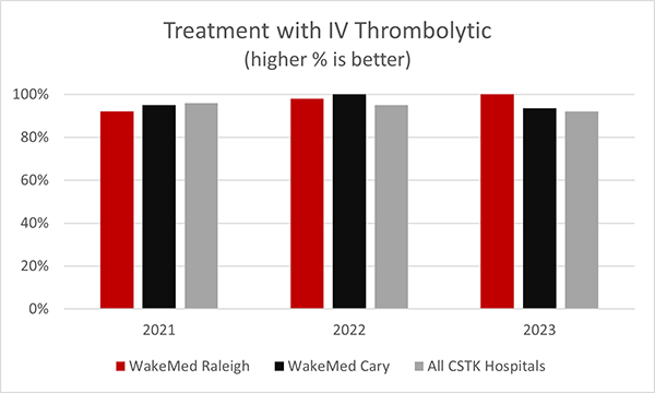 Every minute counts when it comes to stroke, and it is critical for our patients to have access to treatment as quickly as possible to save as much brain tissue as possible. The AHA recommends a goal from patient arrival to the ED to receiving a thrombectomy of 90 minutes. WakeMed continues to improve our times and increase patient access to this care.