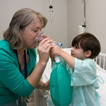 Generally, for younger children, anesthesia is given with a mask since they tend to have a more difficult time with needles. In the operating room, your child will gently breathe in the anesthetic medicines until asleep. After your child is asleep, an IV is inserted to give fluids and any additional drugs.