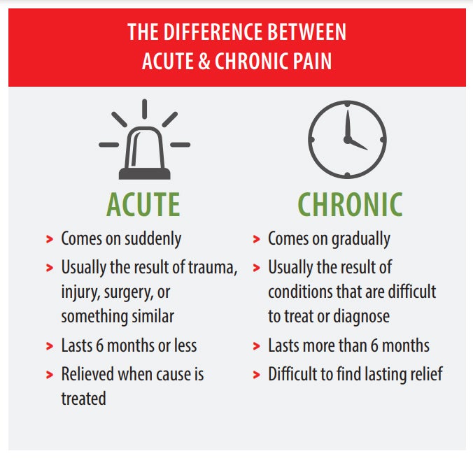 Chronic pain is different from acute pain because it persists long after the initial injury occurred and the body has healed. Changes can happen in brain chemistry and neural wiring in response to an injury that causes the nerves to fire inappropriately and excessively. This is interpreted in the brain as pain.