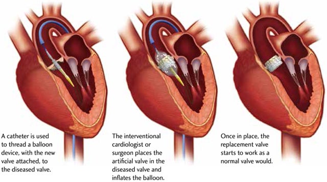 During a TAVR procedure, a very small incision is made in the groin to access the femoral artery or the chest (transapical approach). The cardiologist uses catheters and wires to place the balloon-expandable valve across the old diseased native valve, with the heart still beating. Crimped to the balloon device is the collapsed replacement valve. The surgeon then deploys the new valve within the diseased valve by expanding the balloon together with the new valve. He then secures it into place inside the old valve, displacing the old valve out of the way. In addition, the new valve starts to work as a normal valve should as soon as the balloon is deflated. Most of the time, the patients feel immediately better and start to see improvements in quality of life within several weeks.