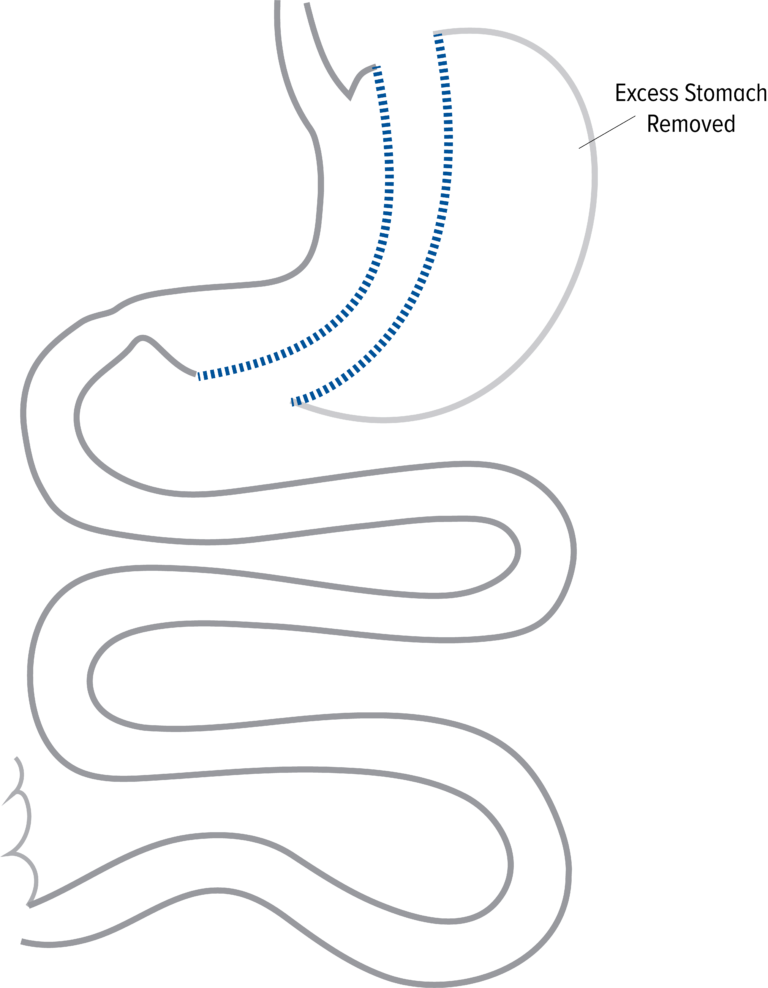 Sleeve gastrectomy is a laparoscopic procedure that reduces the size of the stomach. A normal stomach can hold over a liter of contents. Removing most of the stomach reduces the amount of food the stomach can hold. The size of the stomach after surgery is about 20 percent of its original size.