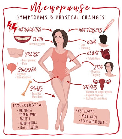 Symptoms and physical changes related to perimenopause can have a significant impact on a woman's sense of well-being. Several symptoms may include headaches, bleeding gums, breast pain and enlargement, bladder urgency and incontinence, bone fragility, hot flashes, hair loss and thinning, heart palpitations, skin dryness and tingling, uterine changes, weight gain, night sweats as well as psychological and mood changes.