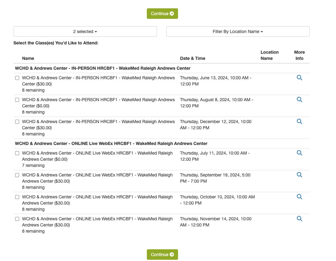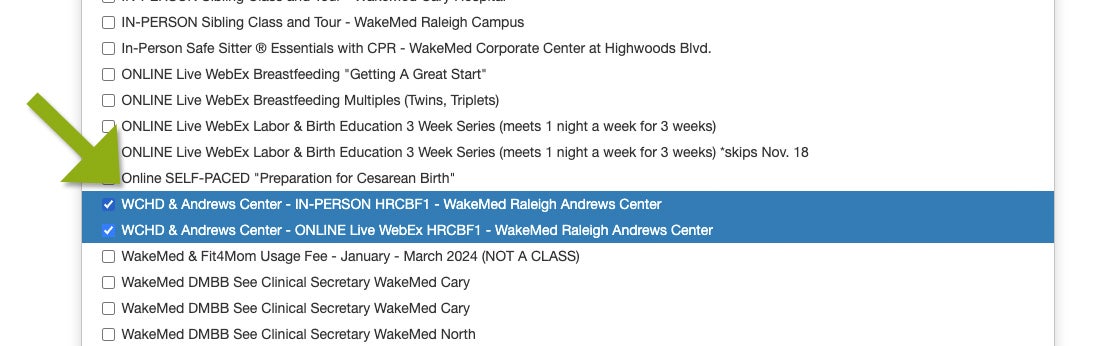 Select the WCHD & Andrew Center - IN-PERSON HRCBF1 - WakeMed Raleigh Andrews Center + WCHD & Andrew Center - Online HRCBF1 - WakeMed Raleigh Andrews Center options from the drop box. Then click behind the menu to close the drop box.