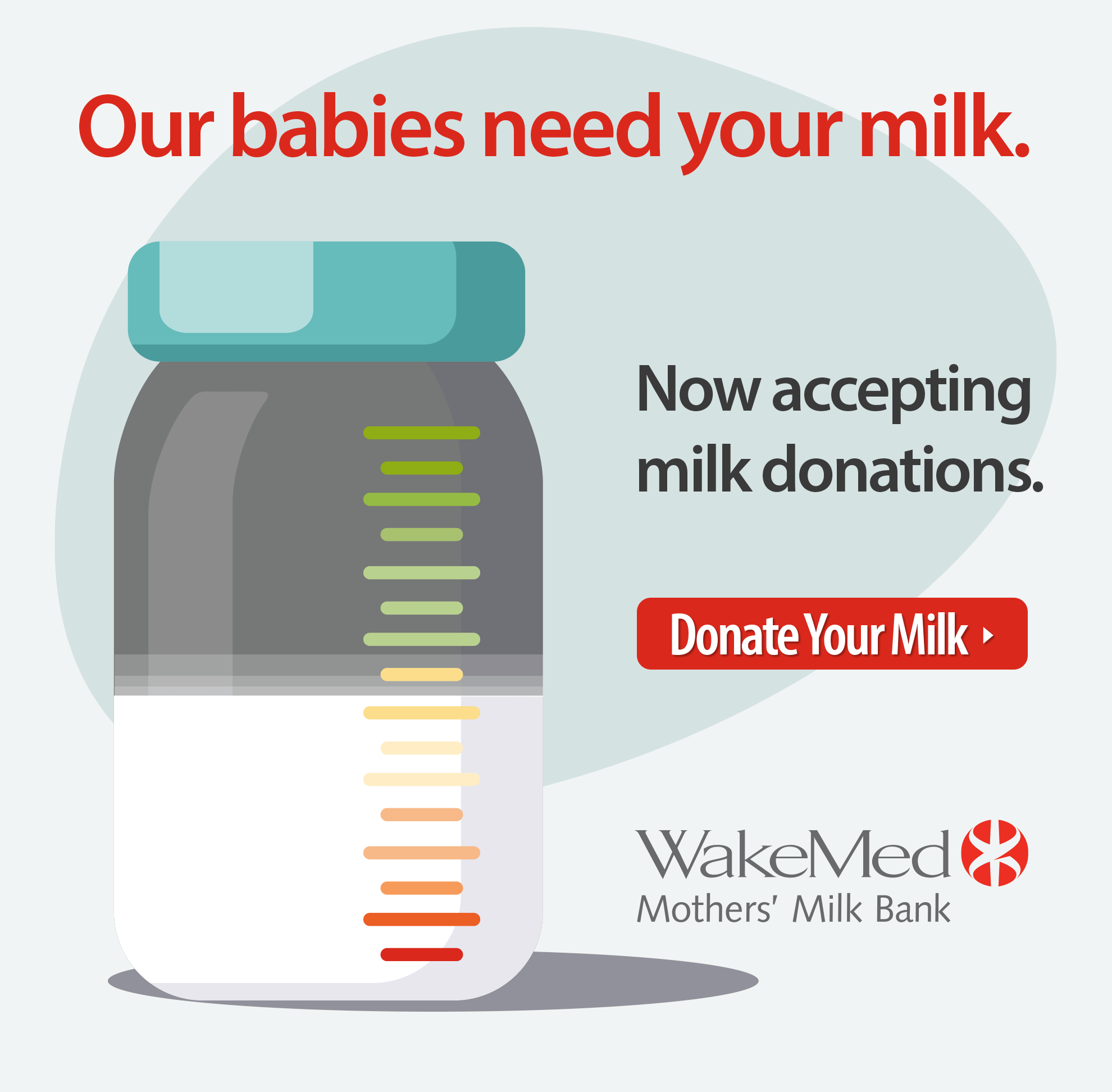 This is where you come in. WakeMed Mothers’ Milk Bank is a non-profit milk bank that provides safe, pasteurized donor milk to babies in hospital NICUs in North Carolina and all along the east coast — breast milk donated by parents like you.