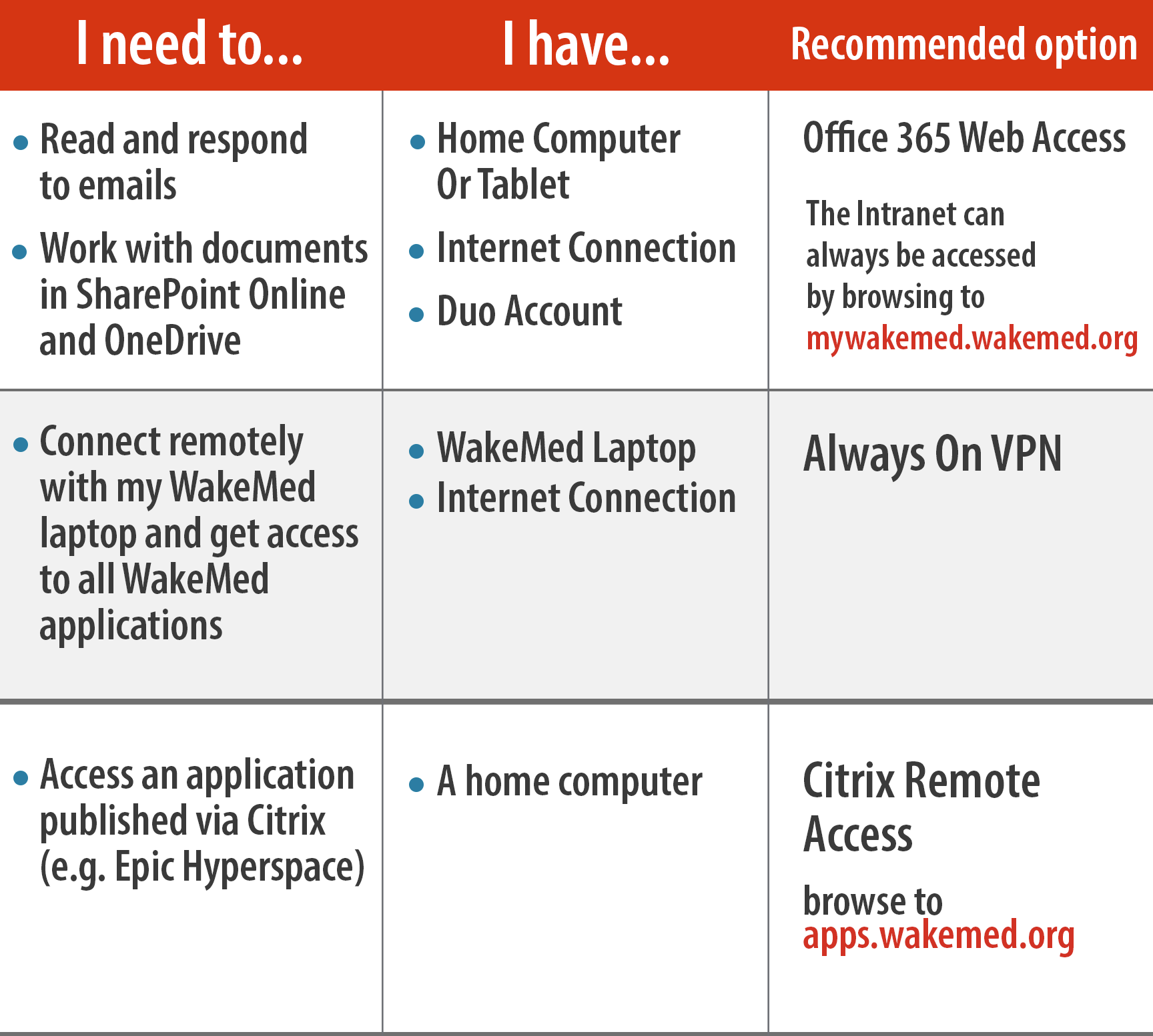 WakeMed offers several options for accessing our network and resources from home. Please see below for details about each available option: