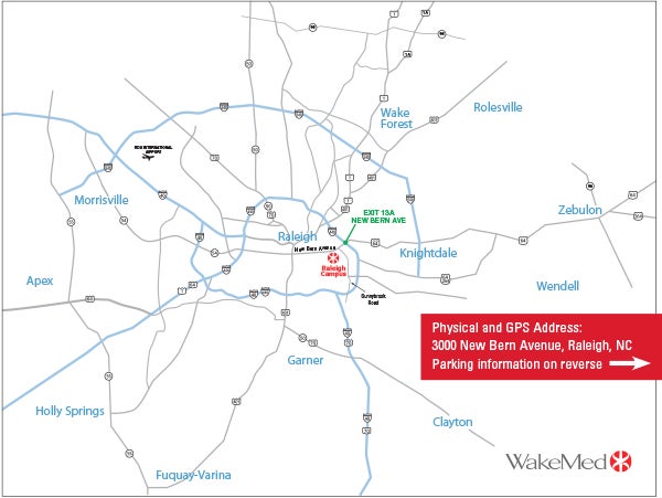 The Medical Simulation Center is located in the Andrews Center for Medical Education on the WakeMed Raleigh Campus. Exit the I-440 Beltline at New Bern Avenue (13A) and drive toward downtown Raleigh. You will pass through two traffic lights. At the 3rd traffic light, turn left at the Emergency Entrance to the WakeMed Raleigh Campus.