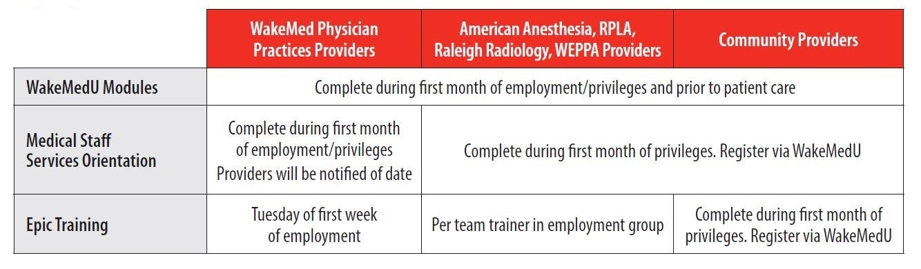 While all new Medical Staff members and APP Staff will be required to complete this onboarding process, the timeframes for completion may vary based on the provider’s employment and association with WakeMed. A summary of the required components and associated timeframes for completion is below: