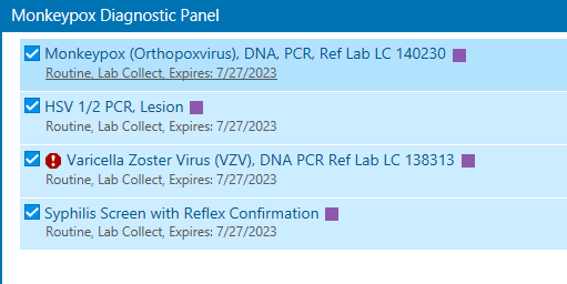 All testing is recommended but tests may be deselected. This panel is only available in Epic. Providers not using Epic should order tests individually.