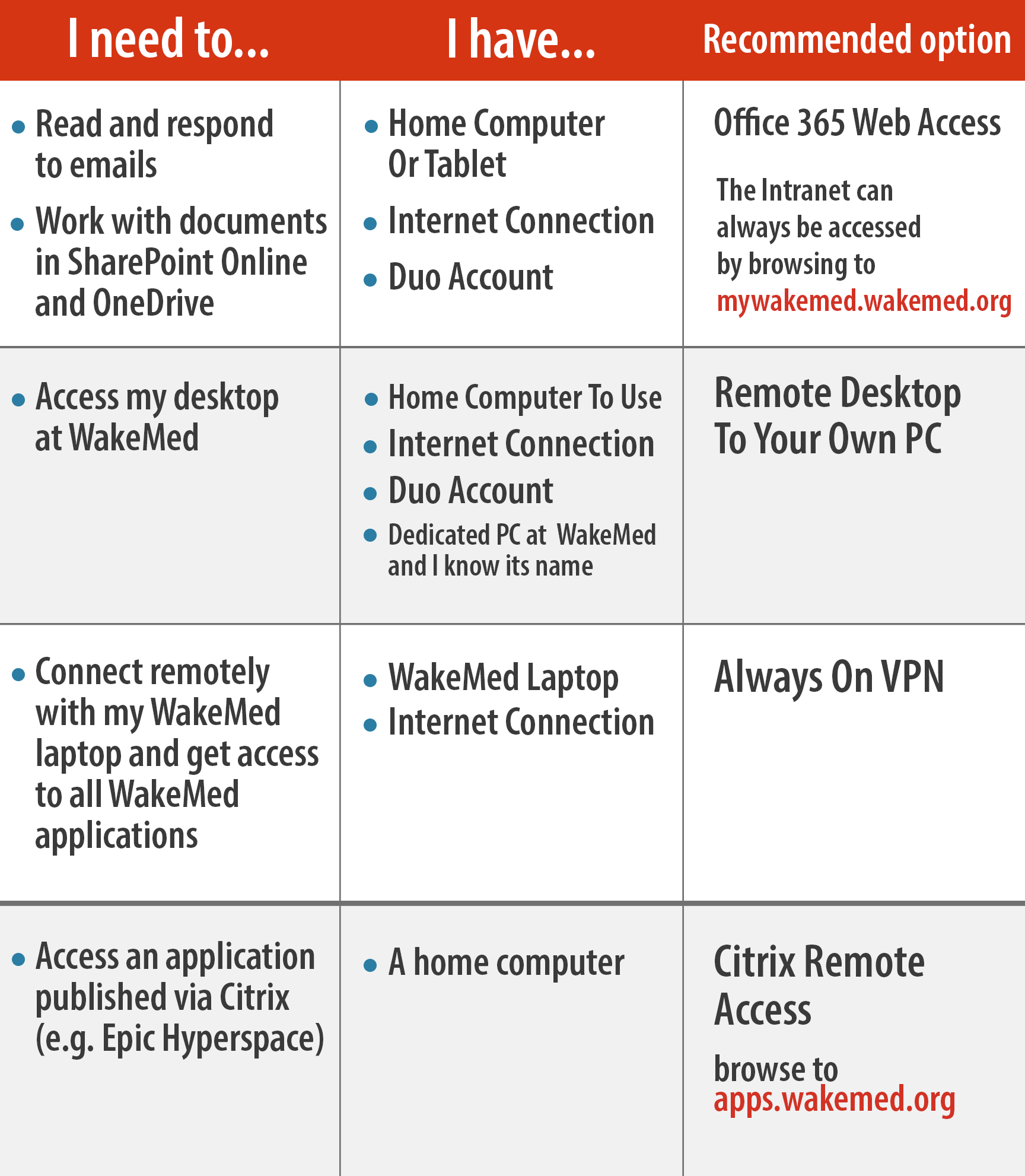 WakeMed offers several options for accessing our network and resources from home. Please see below for details about each available option: