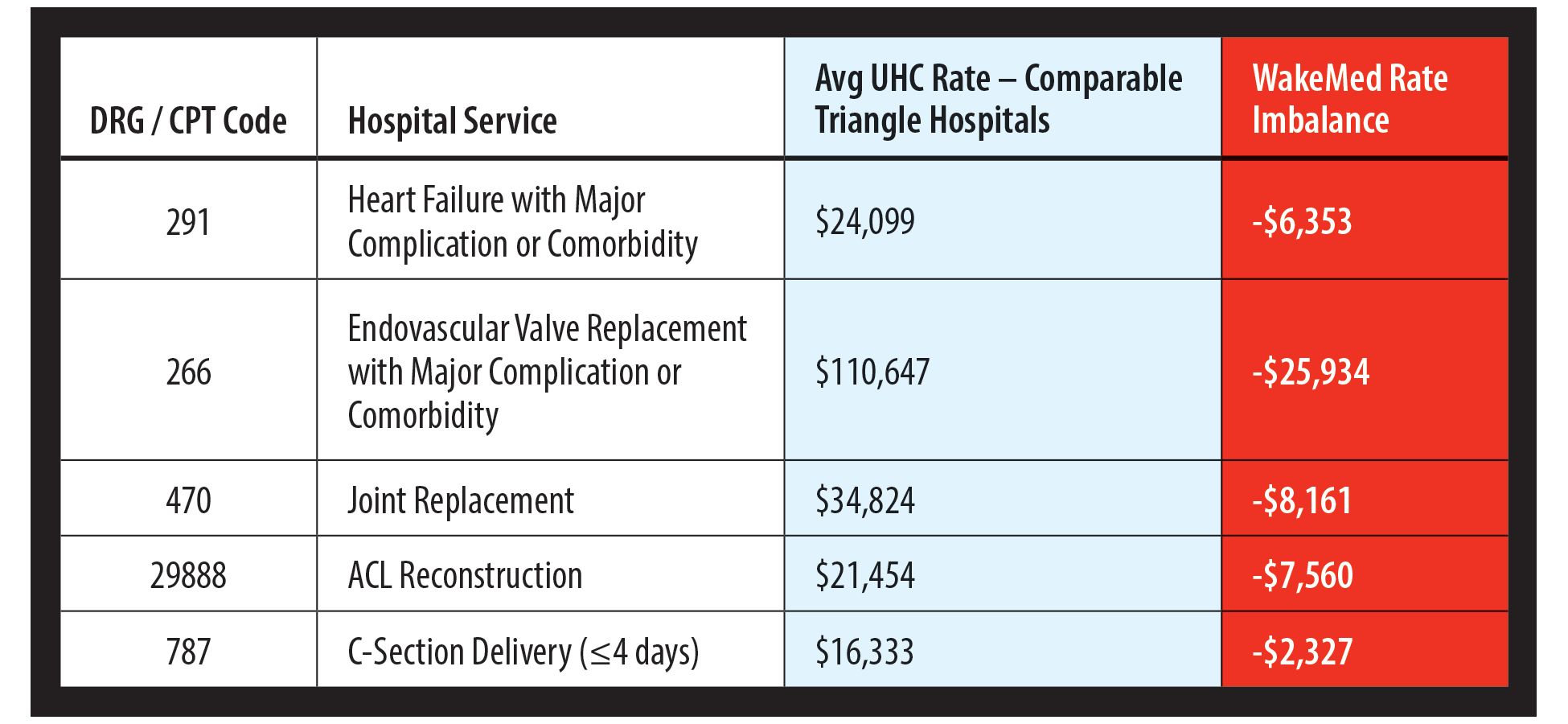 It is also important to note that WakeMed’s proposals are not intended to achieve immediate parity with other systems, but rather to incrementally close a well-documented reimbursement gap and move toward reasonable market alignment over time. Even with these adjustments, WakeMed’s rates would remain below those of comparable high-acuity providers in the Triangle.