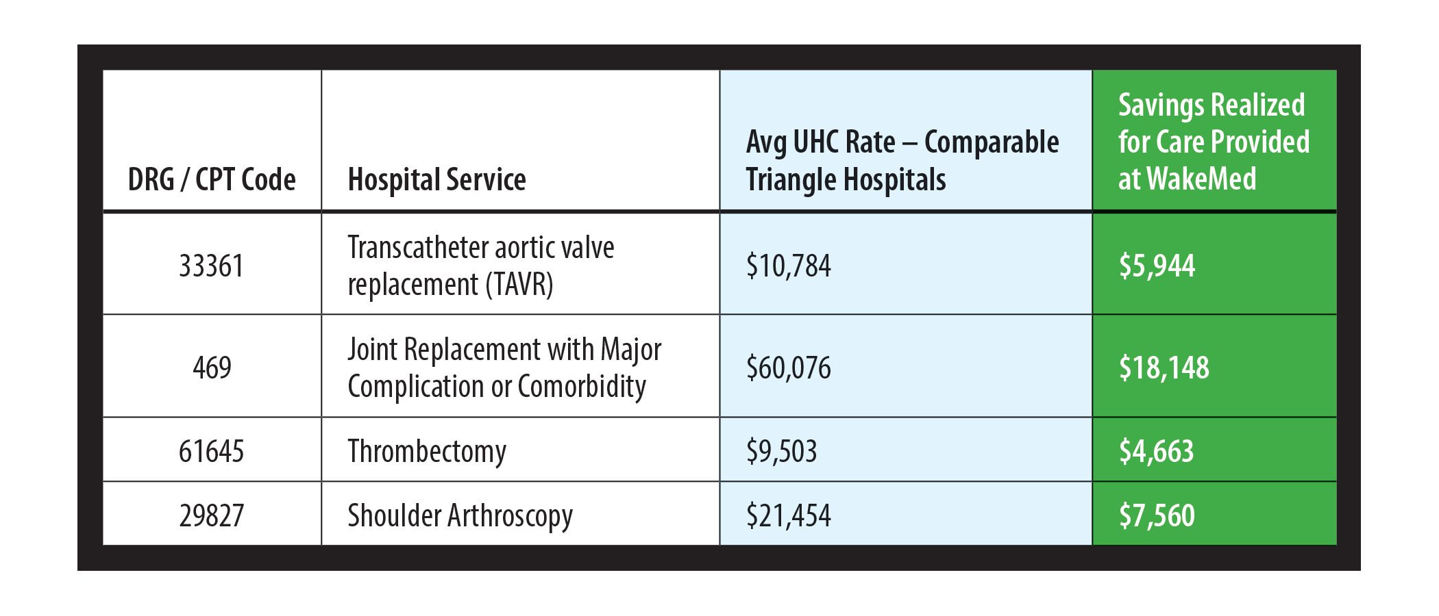 UHC’s publicly reported data (as of November 2025) demonstrates that WakeMed offers a significant cost savings across a broad range of services as compared to other Triangle-area hospitals with a state-designated Trauma Center. The data below illustrates the savings employers and members benefit from by seeking care at WakeMed.