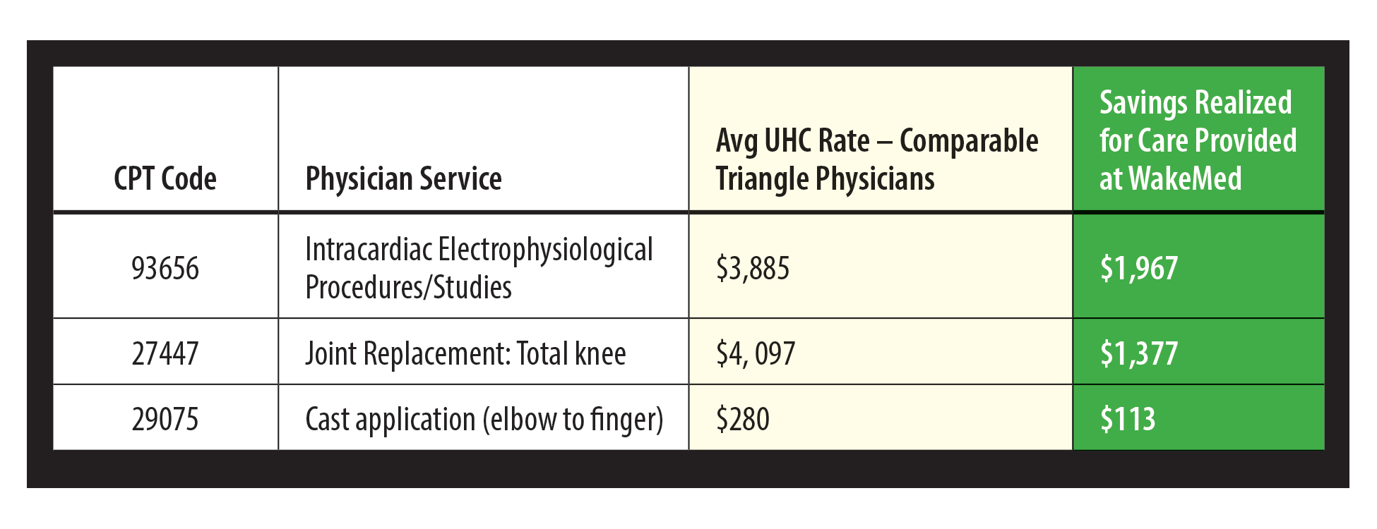 WakeMed understands that consumers and employers do not want to pay more for health care—and neither does WakeMed. Unfortunately, with WakeMed out of network with UHC, your employees have no choice but to use higher-cost hospitals and physicians in the Triangle. This means both the employer and the member are paying more – often significantly more – for comparable services than what WakeMed has asked UHC to pay. In many cases, this results in a higher total cost of care for identical or comparable procedures.