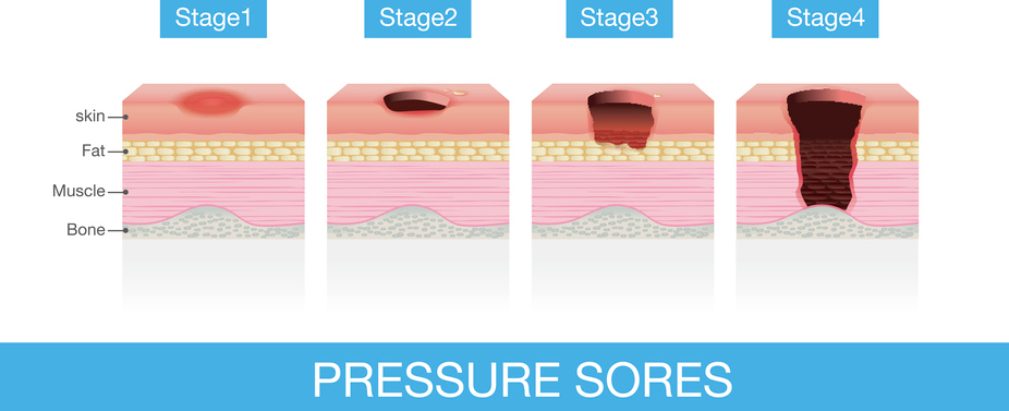 There are four stages of pressure sores. If left untreated, pressure sores will progress from stage one into stages two, three and eventually four. Stage four pressure sores can cause the following: